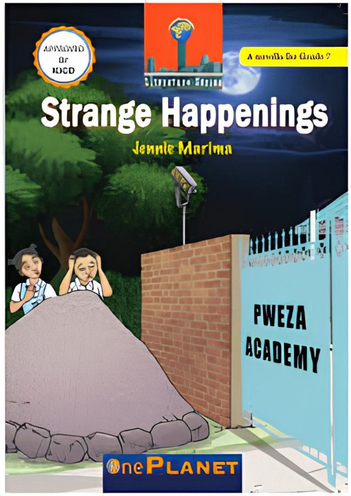 Strange Happenings by Jennie Marima is a novella for Grade 7 students set in Diani, Kenya, about Mwawasi, a boy who joins Pweza Academy and encounters a suspicious teacher, Ms. Kanene, and a mysterious man, Hamisi. Mwawasi is targeted by Hamisi, leading to a dangerous situation at the beach where he is rescued by his sister Chao, but the experience leaves him dehydrated and with memory loss. Ms. Kanene discovers the siblings are related and asks them to keep the secret of the beach, though the overall plot involves their struggle with the strange events and their intertwined fate.